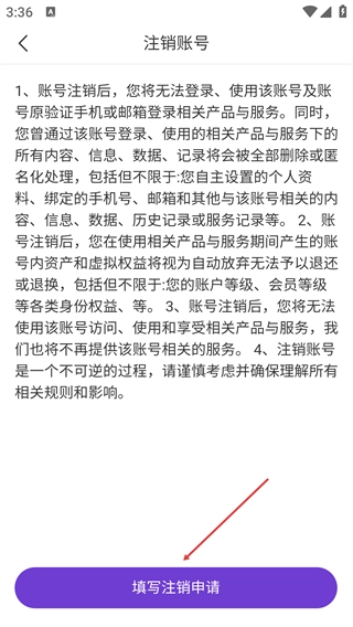 4、阅读注销规则后,点击【填写注销申请】按钮提交账号注销请求。