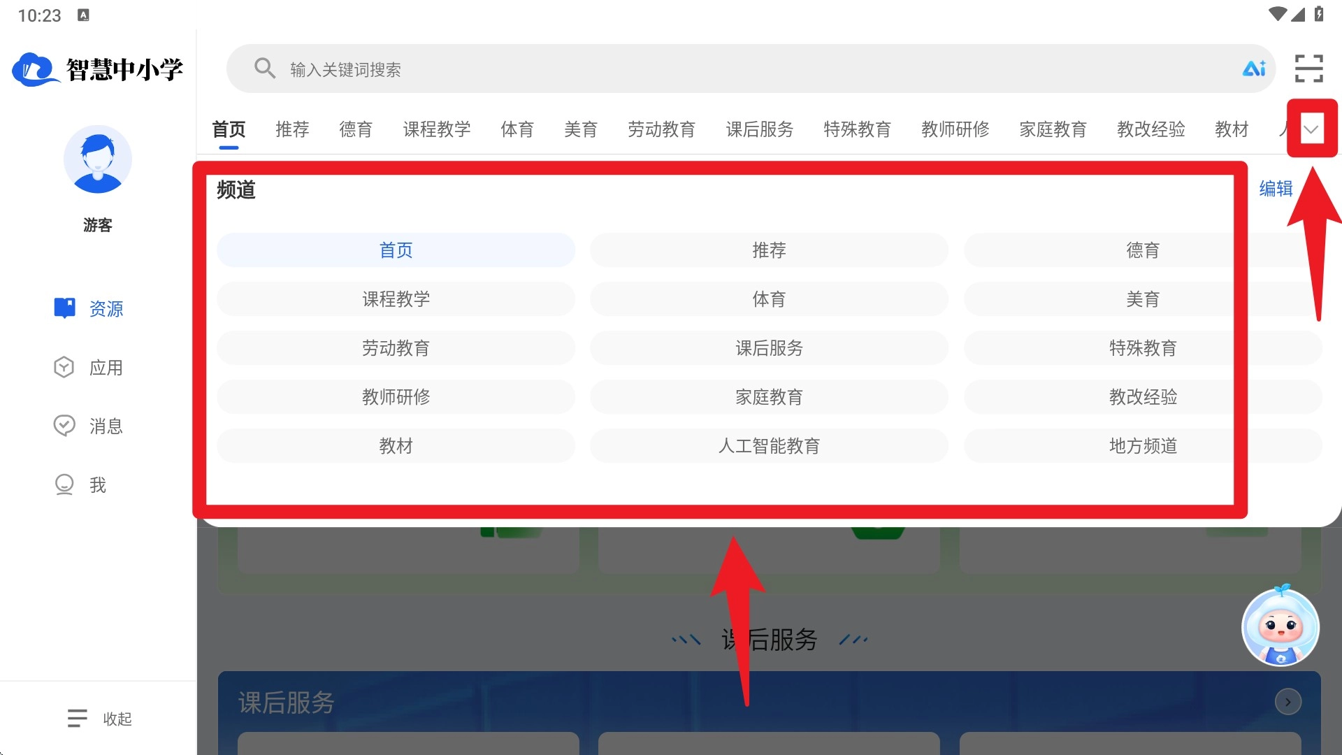 5、返回主页点击右边箭头所指图标,包括教材、家庭教育、AI教育等多个资源栏目可以选择。
