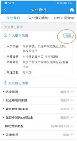 “人员基本信息”部分显示部分人员基本信息,若信息有误,点击右上方“修改”按钮跳转到人员基本信息修改页面进行修改。“失业登记信息”部分需根据提示完善相关信息。