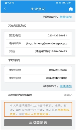 信息完善后勾选承诺部分即可点击“生成登记表”按钮,进入下一个步骤。