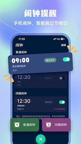 3、集合倒计时、闹钟设置与铃声资源于一体,为您带来功能全面的全新闹钟工具。