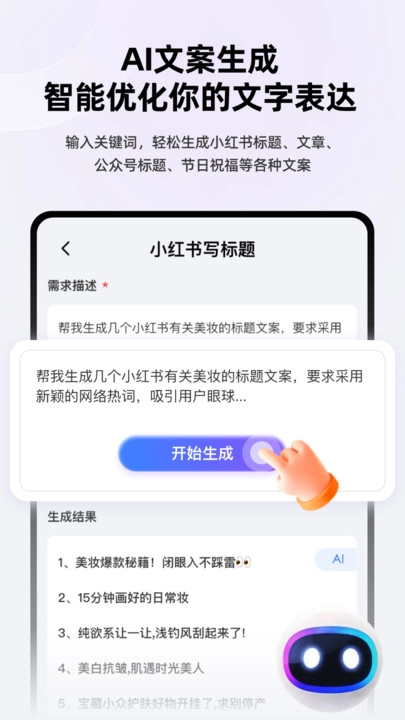 4、输入关键词即可优化文字表达,助你快速获取各类不同文案。