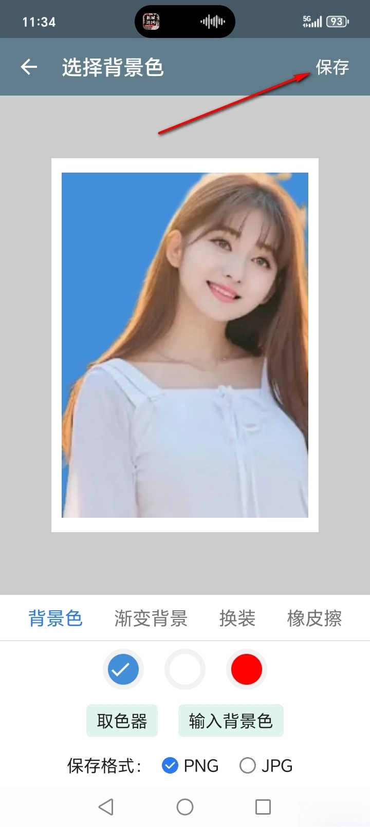 你可以先挑选背景颜色,接着进行换装操作,再选定图片的格式,完成这些步骤后,点击【保存】按钮就可以了。