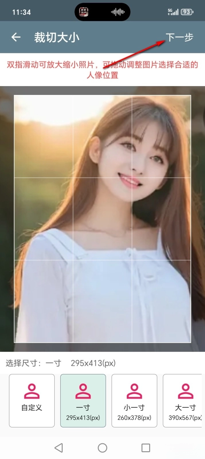 可以通过拍照或从相册导入图片,接着对图像进行调整,再选择合适的尺寸,最后点击【下一步】按钮。