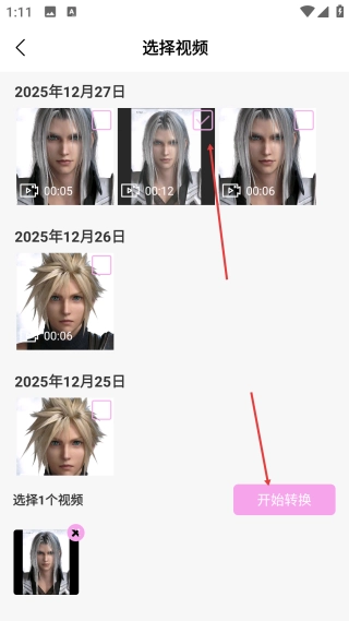 3、在选择视频页,选中【目标视频】后点击【开始转换】进入裁剪编辑页。