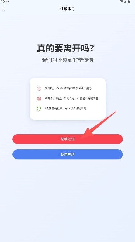 3、在确认页面阅读注销须知、点击“继续注销”按钮以完成申请提交。