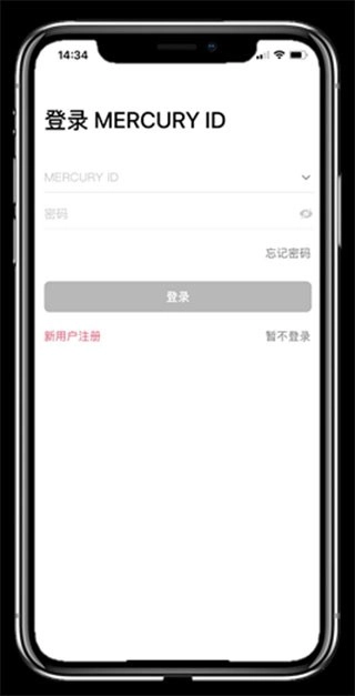 安装水星安防,打开MERCURY安防,输入MERCURY ID的账号和密码,点击 登录。如果没有MERCURY ID,请点击 新用户注册,按照提示注册MERCURY ID,如下图:
