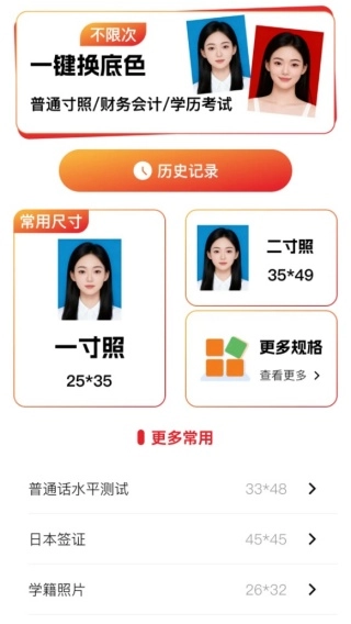1、除了涵盖普通尺寸的照片外,还能精准适配普通话水平测试、日本签证、财务会计考试等各类专项场景所需的照片尺寸。