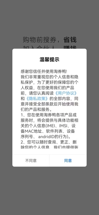 1、在购物前,请先淘券鸭App,安装后快速勾选同意用户协议即可进入首页。