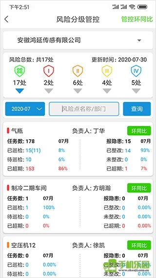 1、能够随时查看企业各部门当月当期的巡检数据,包括已完成巡检、尚未巡检以及已超期未巡检的情况,同时可清晰知晓对应责任人信息;