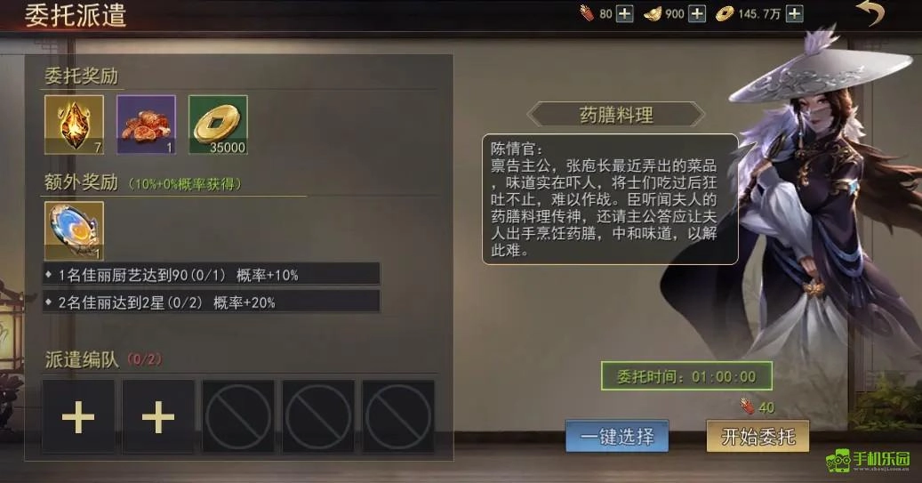 主公点击任意委托即可打开委托详情页面,能直观看到委托奖励、委托条件、派遣时长、派遣消耗等信息。委托奖励的获取方式是,主公派遣指定数量的佳丽并完成任务后就能得到。额外奖励则是完成委托后有较低概率获得,要是达成委托条件,还能提高获取额外奖励的概率。