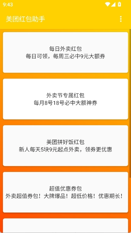美团红包助手的主要功能是助力用户获取各类美团红包,以此降低点外卖的开销。
