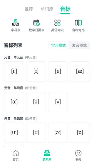 5、还有推荐、单词库以及音标等学习知识,根据自己的需要,选择对应的知识查看