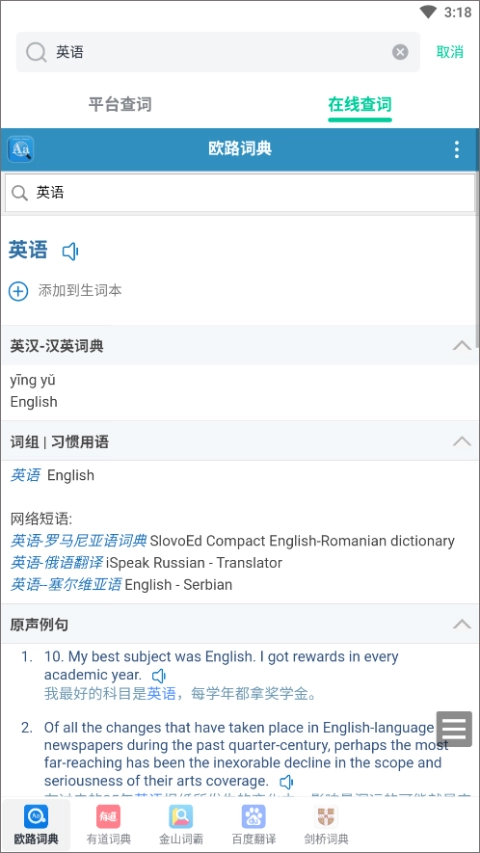 3、应用支持多平台翻译,如欧路词典、有道词典、百度翻译等