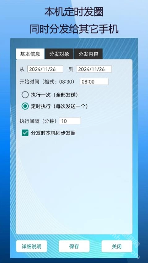 若希望本机也发布朋友圈,可勾选“分发时本机同步发圈”选项。