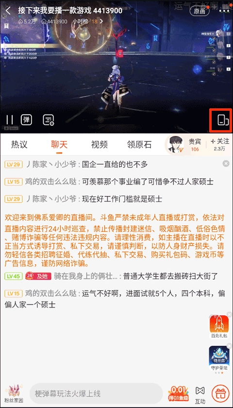2、在直播房间中可以点击屏幕来发现任务栏,点击任务栏上的横屏模式;