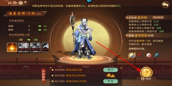 4、当仙阶界面满足升阶条件时,点击升阶按钮即可提升职业等级,同时解锁更高属性以及新外观等奖励。