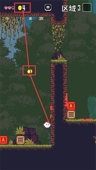 2、进入【区域3】后,操控角色避开红色怪物的攻击,同时借助场景里的元素来击败敌人,要留意保留【3】颗爱心,这样才能防止失败。