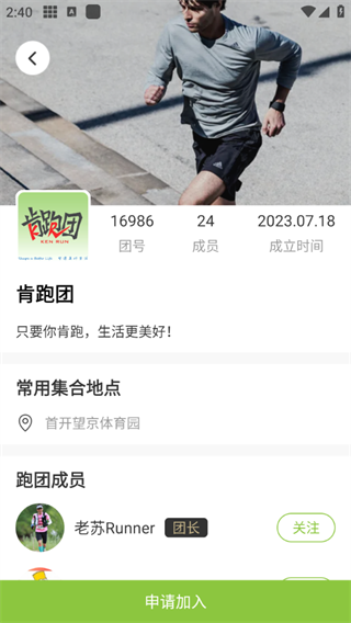 2、在该跑团页面中点击申请加入按钮,对方同意了你就可以加入了。