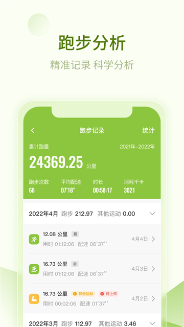 5、【跑步记录】记录跑步轨迹及配速、步频、步幅、距离等跑步数据,并具有统计分析功能。