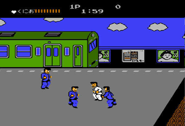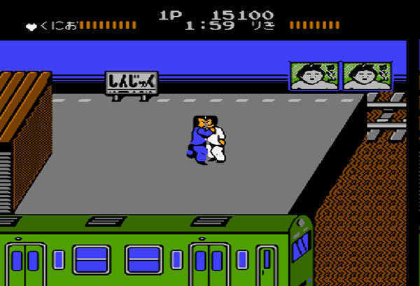 《热血硬派》第一关是在列车站台迎战花园高校,他们的老大是鲛岛力,也就是后来各位老男孩们熟悉的阿力。这里的杂兵们都可以通过背投摔扔到站台下秒杀,最后对战阿力时候,只需将其打至三格血以下就能抓他了,三格血以上BOSS都会反抗,难度也没多大,硬抗或者找机会将其扔下站台就好。从此以后阿力和国夫不打不相识,成为亲密的好基友。