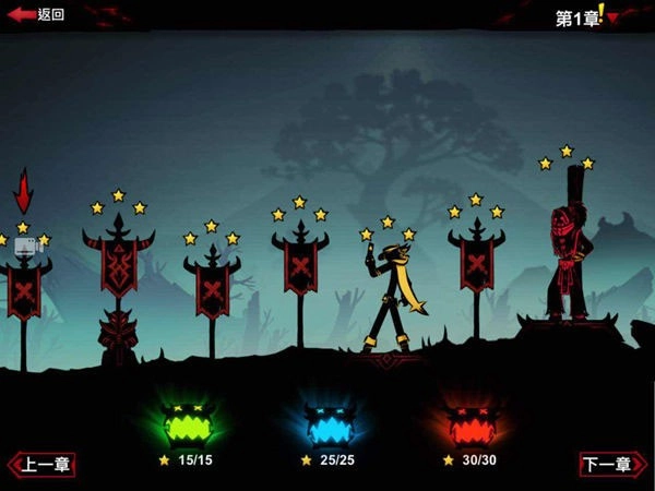 3、《火柴人联盟2》的游戏内容以关卡为基础单位,每五个关卡共同构成一个完整章节。玩家需要完成每一节指定的任务,方可解锁后续内容继续挑战。随着玩家等级的提升与关卡的逐步推进,游戏后续的难度也会随之相应增加!