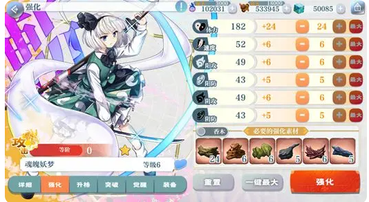 东方LW中由于需要大量的练级,而且练级直接消耗你的体力,同时消耗的体力是根据你的角色的数量和质量(每次突破和觉醒体力消耗+1)决定的,因此为了最速主线三星通关拿到奖励去抽卡,那么练好主力队伍就非常的关键。