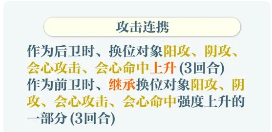 因为每次只能出战3人,且前后排换位CD非常长,因此合理的安排队员及站位,非常重要。通常攻击连携是最佳选择。