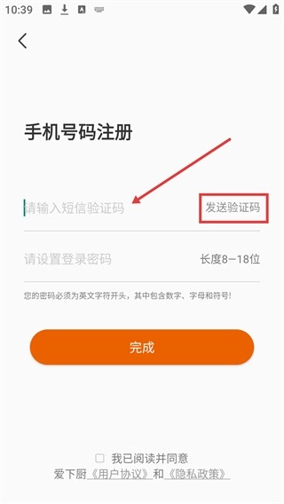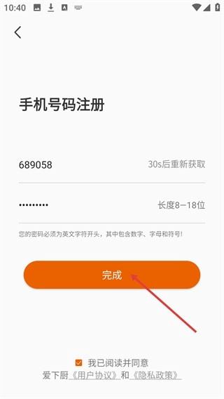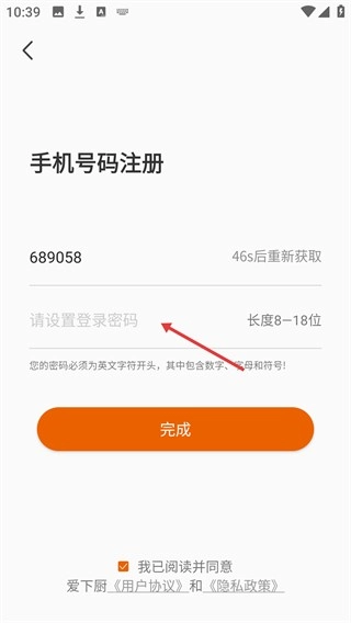 填写好验证码以及符合要求的登录密码后,点击【完成】按钮,即可完成爱下厨的手机号码注册流程。