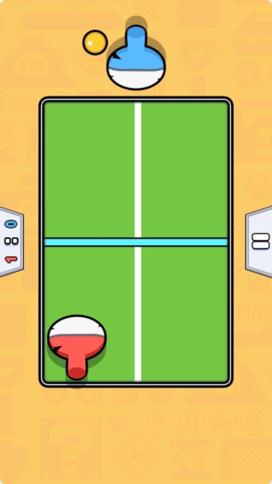 2、通过点击滑动操控红蓝球拍的左右两侧,击打黄色乒乓球,使球落在对方半场。同时,借助箭头指引来预判球路。