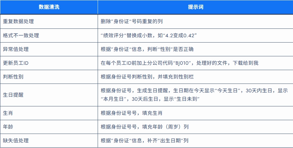 无论是重复数据处理、格式不一致处理、异常值处理、更新员工ID、判断性别、设置生日提醒,还是计算生肖、年龄、处理缺失值……这些事项都能通过一句话轻松完成。