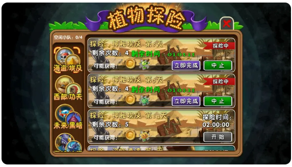 接下来大家应该过了神秘埃及第九天了吧?在这一天过完之后会开启卷心菜投手的植物探险,每次两个小时,每天可以探险五次。意思就是说,每天大家只要花10个小时探险就可以在42天获得5阶卷心菜了。