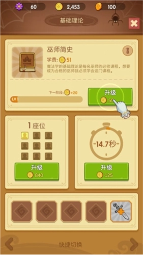 第三个要讲的是圣水的使用。有个类似钻石的道具(具体叫什么我不太清楚),除了第一次用来购买老师和教室相关的道具外,剩下的基本就只能用来升级圣水了。大家不用太吝啬,后面你会攒下好几千用都用不完。建议优先把所有科技都解锁出来,之后再考虑升级圣水。升级的时候,优先提升圣水的产出效率和角色的动作速度,这两项最高能升到40%。角色的动作速度提升后,你会明显感觉到小人走得更快了。第一章里,小人住宿舍是先进去睡觉,然后再去食堂吃饭。后期睡觉的时间可以升级到只需要4秒,吃饭也只要2秒,但最耗时的其实是走路的过程,所以升级动作速度真的很关键。