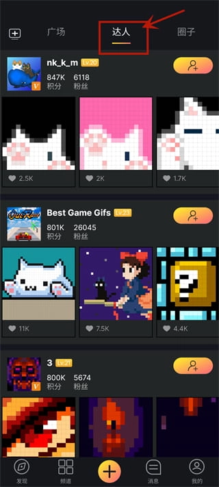 进入应用后,点击页面中间的方块按钮,就能浏览广场上的各类动态,查看其他用户分享的作品。