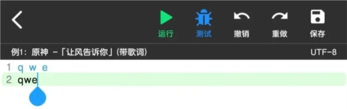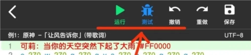 菜菜音乐盒提供了两种用于测试弹琴脚本的方法:其一为“运行”,该功能的作用是播放完整的脚本内容;其二是“测试”,此功能则是播放左侧序号旁带有蓝色标记的单行或多行脚本。
