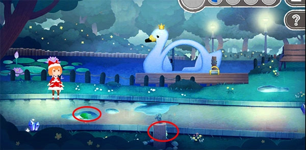 咦?池塘里的荷叶上居然沾着颜料呢!快坐上那只天鹅船划过去瞧瞧吧!记得点点船上的锁,按照之前看到的动物顺序来输入密码,咻咻咻——锁就打开啦!坐进船里,颜料就能拿到手咯,第一个收集任务圆满完成!