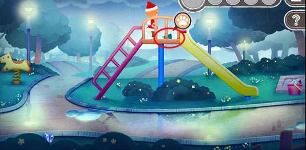之后,我们溜达着来到了滑滑梯这儿,嘿!滑梯顶端也藏着颜料,不过有只小青蛙在那儿守着呢,爬上去把小青蛙交给他,第三个颜料就轻松到手啦!