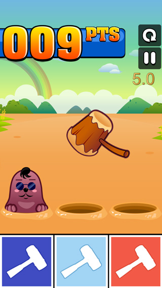 3、下面可以看出是游戏实际操作图,下面三个锤子对应三个洞,大家要准确的敲打。第一不能直接点击地鼠,第二要点击对应的锤子。