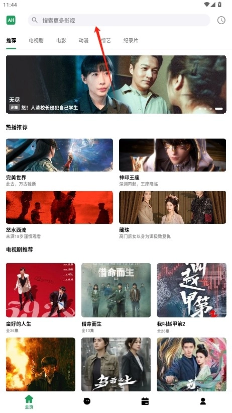 进入软件主页后,我们点击主页顶部的搜索框,输入关键词即可搜索想要观看的影片。