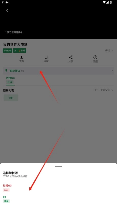 进入播放界面后,中间的解析接口能够打开接口列表,以便切换其他播放源。