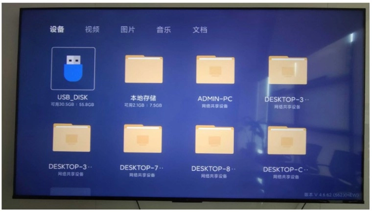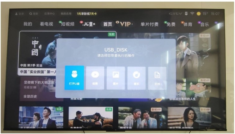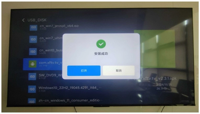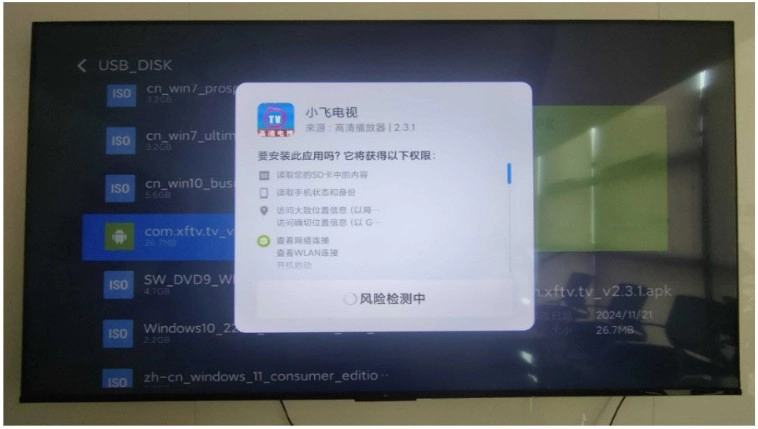 2、把存有好的小飞电视安装包的U盘插到电视的USB接口,电视会提示检测到新的USB设备并询问是否打开。