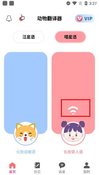 2、在输入框中长按就能录制声音,松开手后系统会自动把它翻译成“瞄星语”或“汪星语”,还会自动播放出来。反过来,如果录制狗狗或猫咪的叫声,也能将其意思转换成中文。