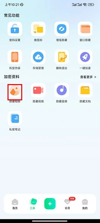 2、在工具页面,点击【隐藏相册】;