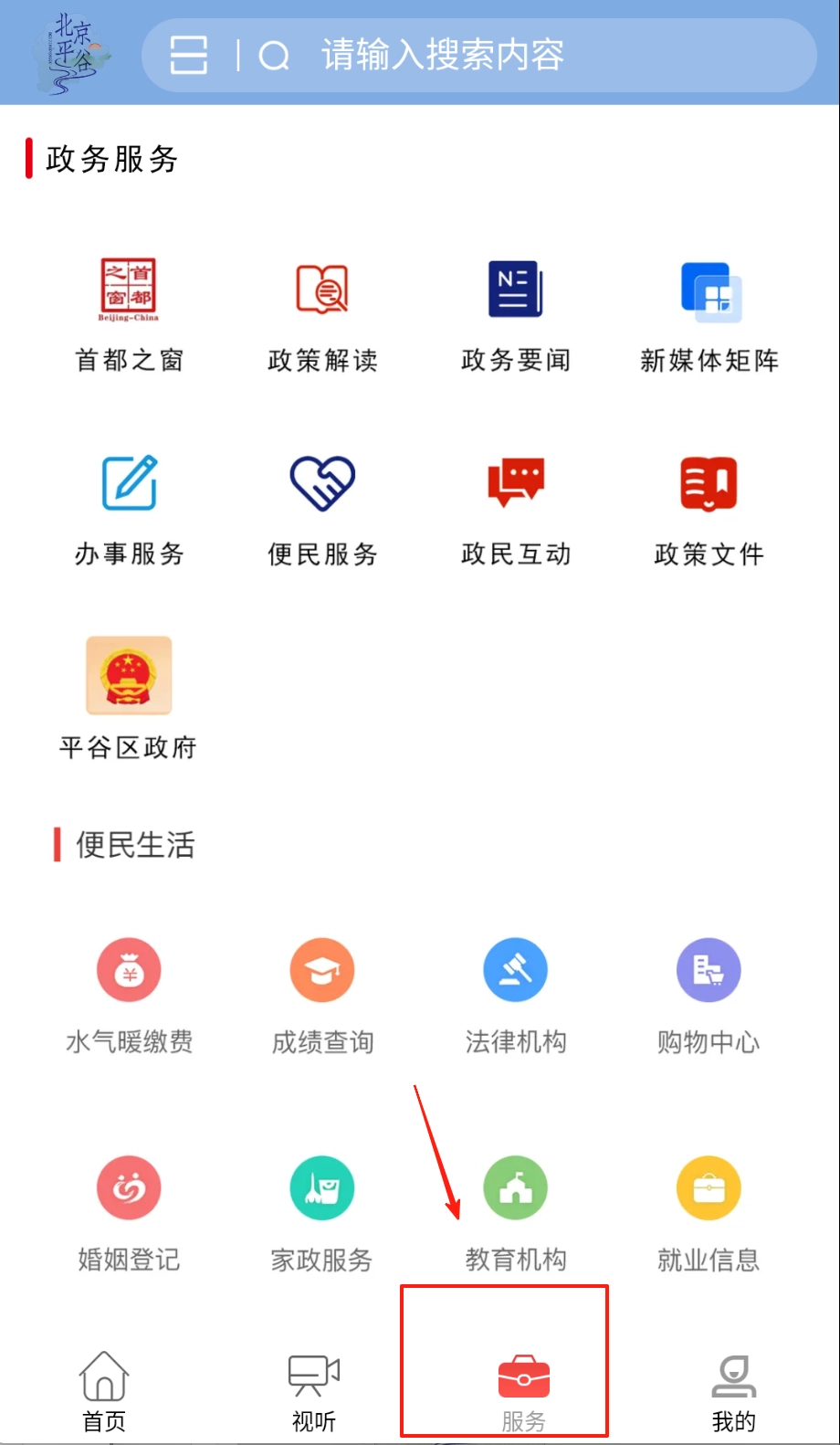 在搜索框输入关键词就能快速定位到目标新闻;服务页面还能在线办理政务业务、生活缴费等各类便民事项。