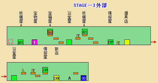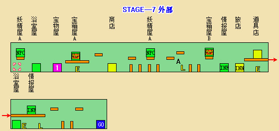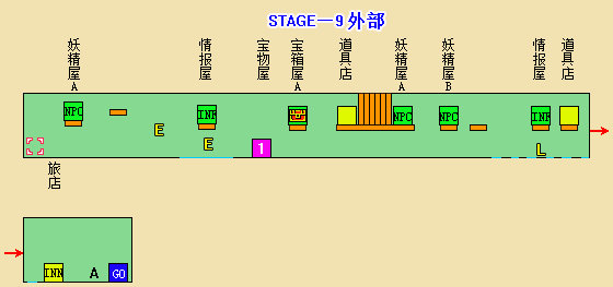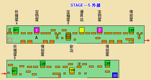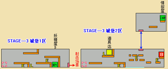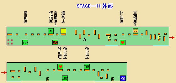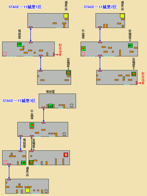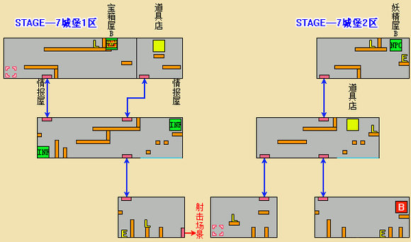 ※不愧是最后一大关,没有宝物屋和旅店,敌人却没有减弱。补血房里有生命盒,但里面同样有敌人守着。中部附近有个隐藏门(A点),射击才会出现,里面是妖精房B。因为五颗星都得到了,不必理会,直接进入终点即可。