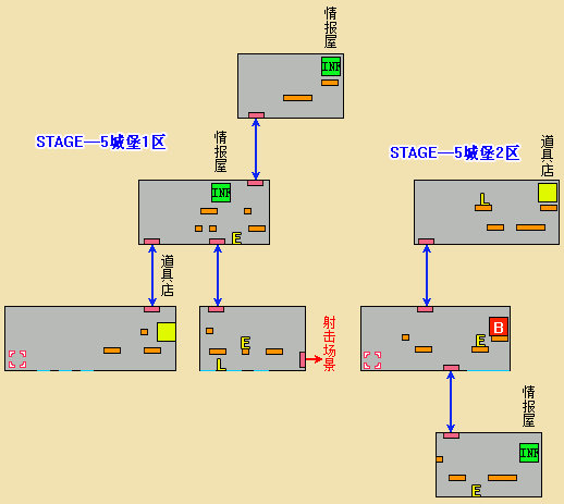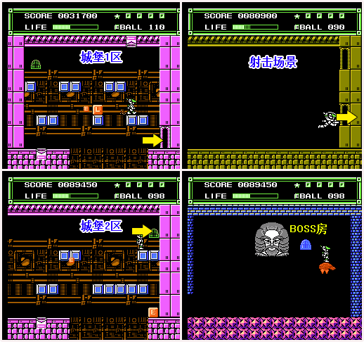一开始位于城堡1区,进入东北角的通道,去射击场景。射击场景里,依次进入上方入口→下方入口→上方入口,来到城堡2区。到达城堡2区后,连续进入下方通道,去迎战BOSS。