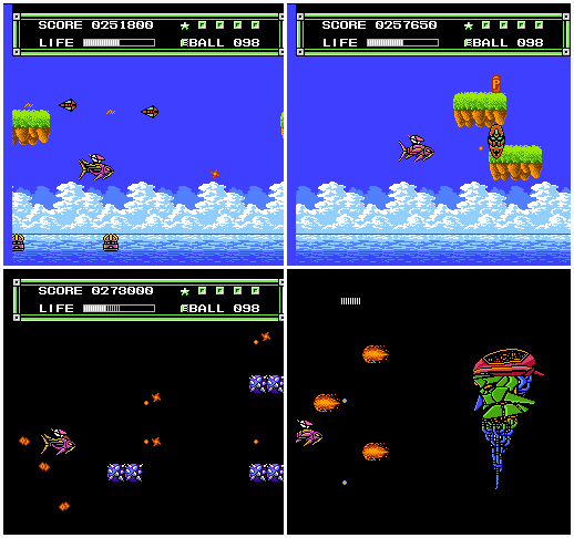BOSS【水蚤】会发射弹丸和吐小水蚤,它的弹丸可以无视,麻烦的是小水蚤,精度很高,当它们靠近时高速后退可躲开。胜利后救出第一关的公主,主角乘鱼船去下一关。(过关后血槽增加)
