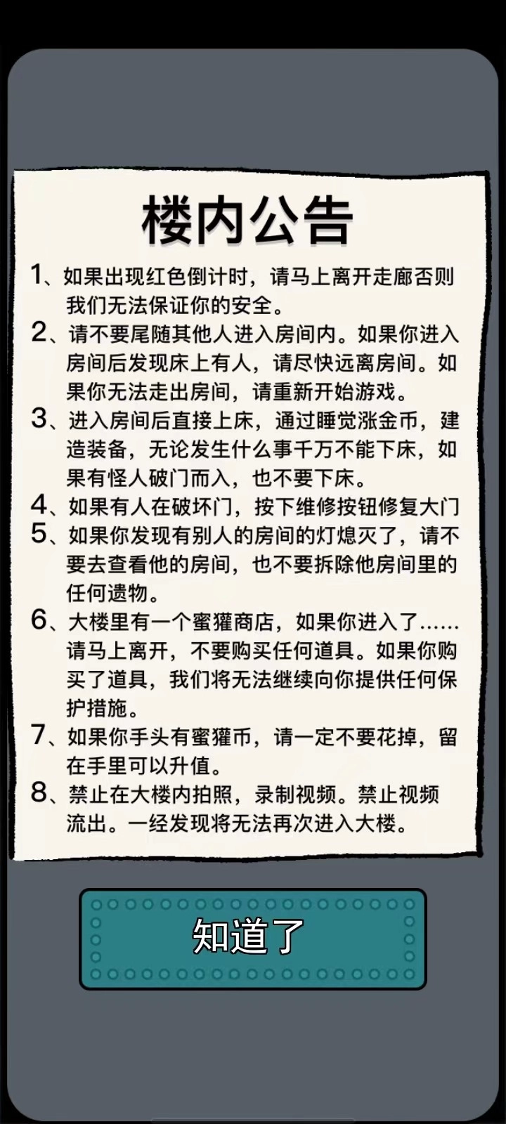 4、进入游戏后,玩家需要在倒计时结束前找到一个无人的房间,按照游戏里绿色的指引进入房间(别忘了关上大门),接着躺在床上睡觉就能持续获得金币;另外完成任务也能领取金币,比如升级床、大门以及建造各类建筑物。