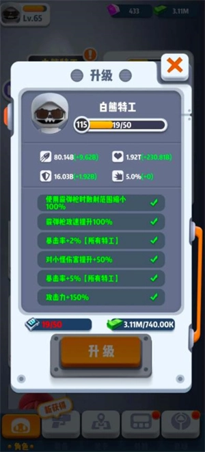 到第71章时,能获取的资源就到顶了,之后就可以一直刷这一章。等所有章节都通关后,钻石可以用来购买纸钞、开箱子之类的。至于其他特工,建议先不着急买,要是想买的话,优先考虑白熊特工,它在无限模式里刷资源特别好用。