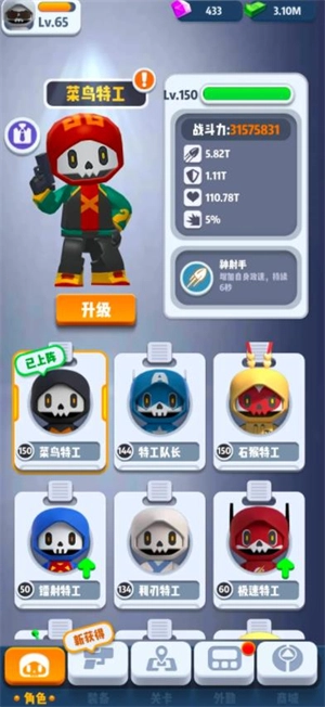 新手刚开始玩游戏时选菜鸟特工就行,等打到第八章解锁猴子特工后,会发现它主要就是打死小怪能回血这个能力比较突出。另外也可以攒钻石买利刃特工,它的暴击回血效果比猴子要强不少。等推进到31章之后,掉落的装备就全是紫色的了,这时候可以先在31章刷一阵子,攒些橙色装备,再接着往后推进章节。